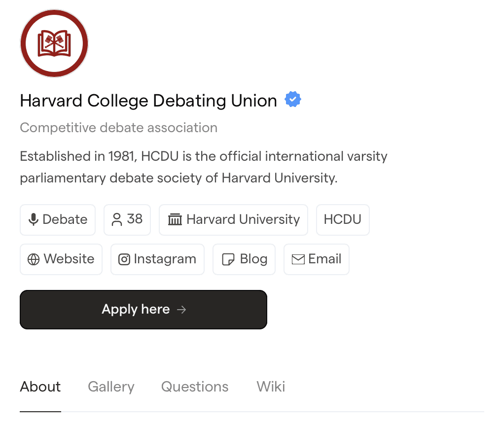 The alternative is to target specific extracurricular categories and scale from there. By extracurricular categories, I mean fields like debate, hackathons, science fairs, book clubs, sports varsity teams, gaming clubs, student newspapers, etc. Of these fields, I think we should target the debate category first by launching our first closed beta for global debate societies and competitions (like KNC, NEADC, Australs, WUDC, etc).