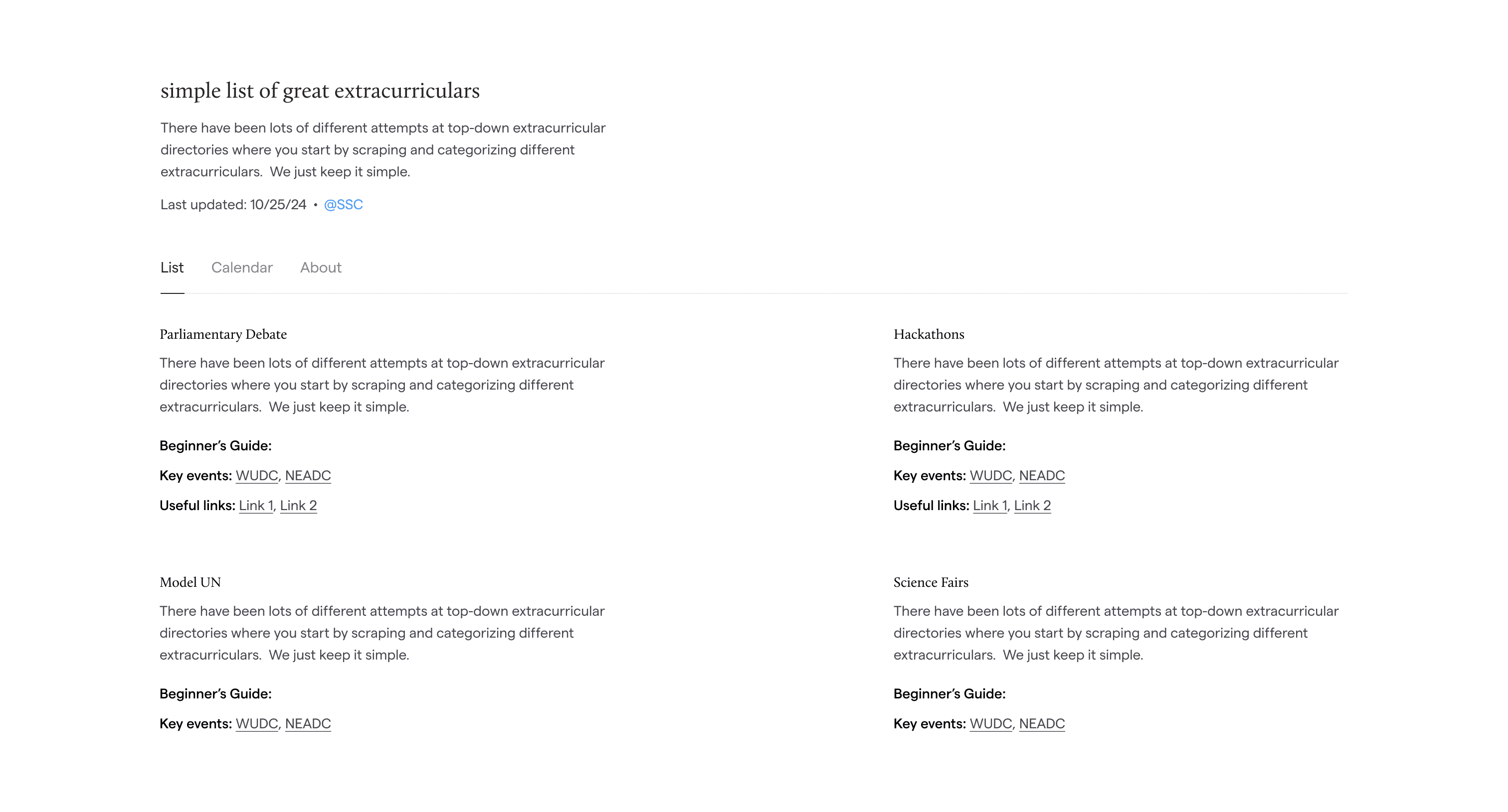 The TLDR hypothesis of this memo: we need to conduct targeted experiments on extracurricular categories like debate and hackathons to assess the type of software students genuinely need, whether that be centralized calendars, unified libraries for resources, custom "blocks", site-builders, event page archiving, etc.
